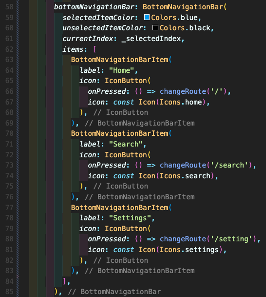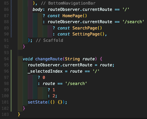 Step 7: 하단 네비게이션 바 부분입니다. 66, 73, 80번째에 changeRoute 부분 함수를 호출하는데 이 부분은 아래에 작성했습니다.