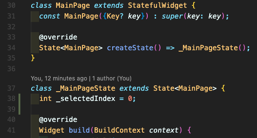 Step 5: MainPage 클래스를 작성하시고 _selectedIndex 변수를 선언합니다. (탭 이동할 때 인덱스 체크 역할)