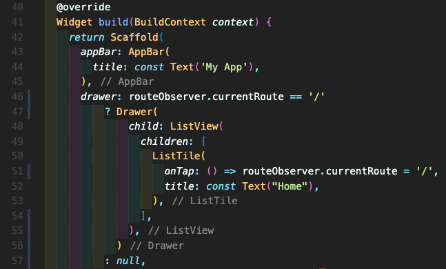 Step 6: 46번째에 현재 루트가 Home인 경우에만 Drawer 메뉴를 보이게 하고 싶으시면 ? : Ternary(삼항) 연산자를 활용하면 됩니다. 예를 들어 1 +2 == 3 ? true : false 인 방식입니다. 즉 null로 값을 주면 보이지 않는 효과를 연출할 수 있습니다.