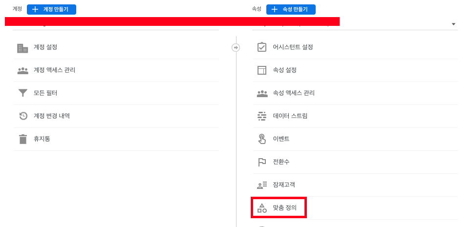 Step 15: 구글 애널리틱스4에 접속하셔서 왼쪽 아래에 관리(설정) 아이콘 누르시고 맞춤 정의를 선택합니다.