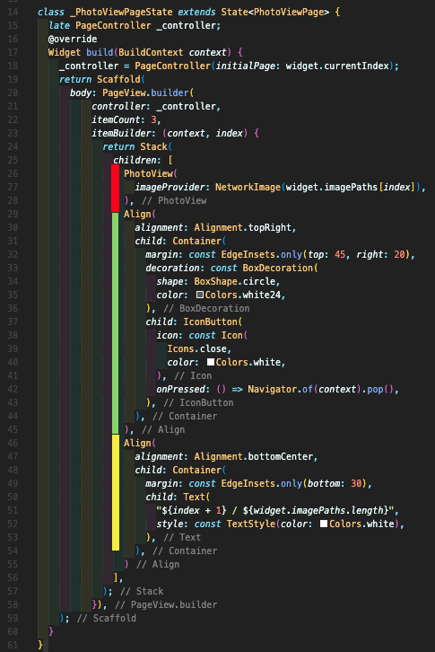 Step 3: 그 다음 여러 장의 사진을 좌우로 스크롤하며 볼 수 있도록 만들어주는 PageView.builder를 먼저 작성하시고 그 다음 제가 아래 빨간색, 연두색, 노랑색으로 표시한 부분들을 작성합니다. 빨간 색의 PhotoView 위젯은 사진을 표시하는 위젯, 연두색 부분은 사진을 보고 닫을 수 있는 버튼, 노랑색 부분은 현재 슬라이드 위치를 표시하는 Indicator 역할을 합니다.