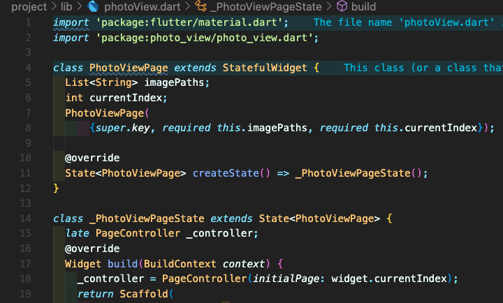 Step 2: 먼저 사진을 탭했을 때 보여주는 photoView.dart 파일을 하나 생성해주시고 코드를 작성해줍니다. 전체 코드는 맨 아래에 있으니 참고하시기 바랍니다. 여기에서 5~8번째 줄에 변수들을 선언하시고 추후 arguments로 패스할 수 있도록 합니다. 15번째 줄에 보시면 PageController 인스턴스 변수도 만들어주시고 18번째 줄에 인스턴스화 해줍니다. 여기에서 initialPage 매개변수를 currentIndex를 주셔서 어떤 사진을 클릭했는지를 알 수 있도록 전달해 주시면 됩니다.