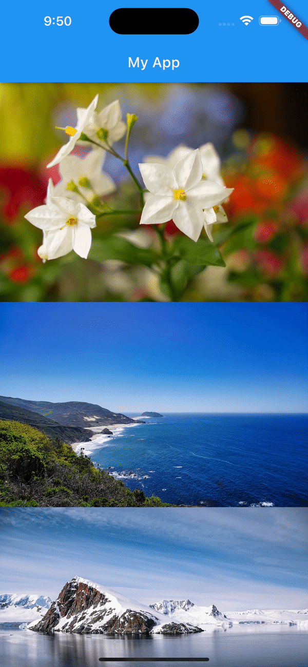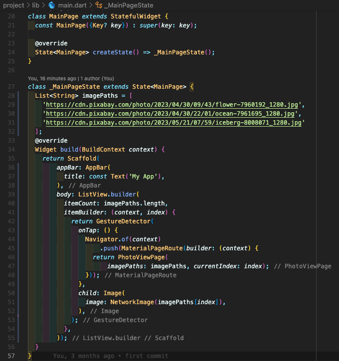 Step 4: main.dart 부분에 다음처럼 작성합니다.여기에서 28~32번째 줄에서는 image 링크 리스트를 만들어주시고 39번째 줄에 ListView.builder를 통해 이미지들을 쭉 세로로 보여줍니다. 그리고 그 화면을 탭했을 때 위에서 만든 PhotoViewPage로 넘어갈 수 있도록 GestureDetector를 통해 구현해줍니다. 만약 Gesture 부분을 자동으로 하고 싶은 경우에는 PhotoViewGallery 위젯을 사용하셔서 구현할 수도 있습니다. (PhotoViewGallery.builder 형태)
