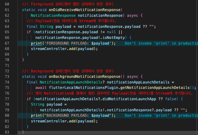 여기에서 중요한 부분은 아래 부분입니다. 주석에 설명을 달아 놓았습니다. 다만 제 테스트에 의하면 Foreground는 안드로이드, iOS 모두 작동되나 background 부분은 안드로이드만 제대로 작동되며 iOS의 경우, 앱이 완전히 꺼진 경우에는 앱은 켜지나 아래 메소드가 제대로 작동되지 않습니다. (추후 방법이 있는 경우 수정하도록 하겠습니다.) 여기에서 핵심 부분은 stream을 활용한다는 것입니다. Stream의 add를 통해 payload(전달 데이터)를 전달해서 조건을 알 수 있도록 합니다.