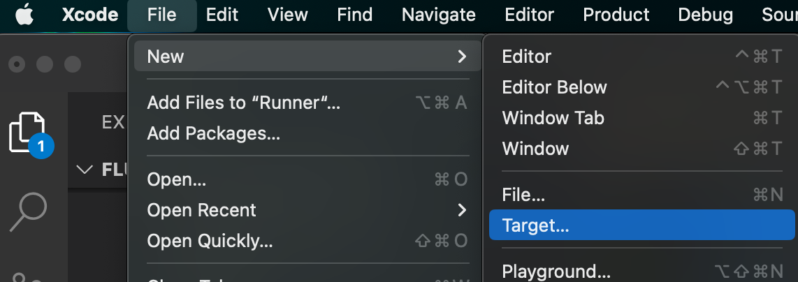 Step 3: XCode를 열어줍니다. VSCode 등 에디터의 터미널에서 open ios/Runner.xcworkspace로도 열 수 있습니다. 그 후 File -> New -> Target을 선택합니다. (안드로이드 구현하시는 분은 Step 9로 가셔서 진행하시면 됩니다.)