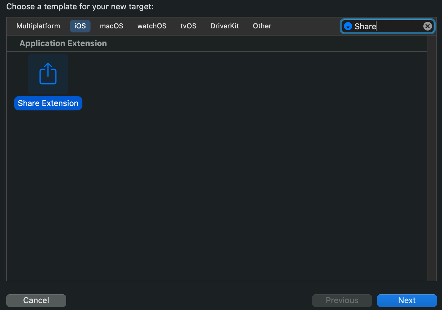 Step 4: Share Extension을 선택하신 뒤 Next를 클릭합니다. 그 후 product name은 Share Extension으로 입력 후, team 선택 후 넘어가시면 됩니다.