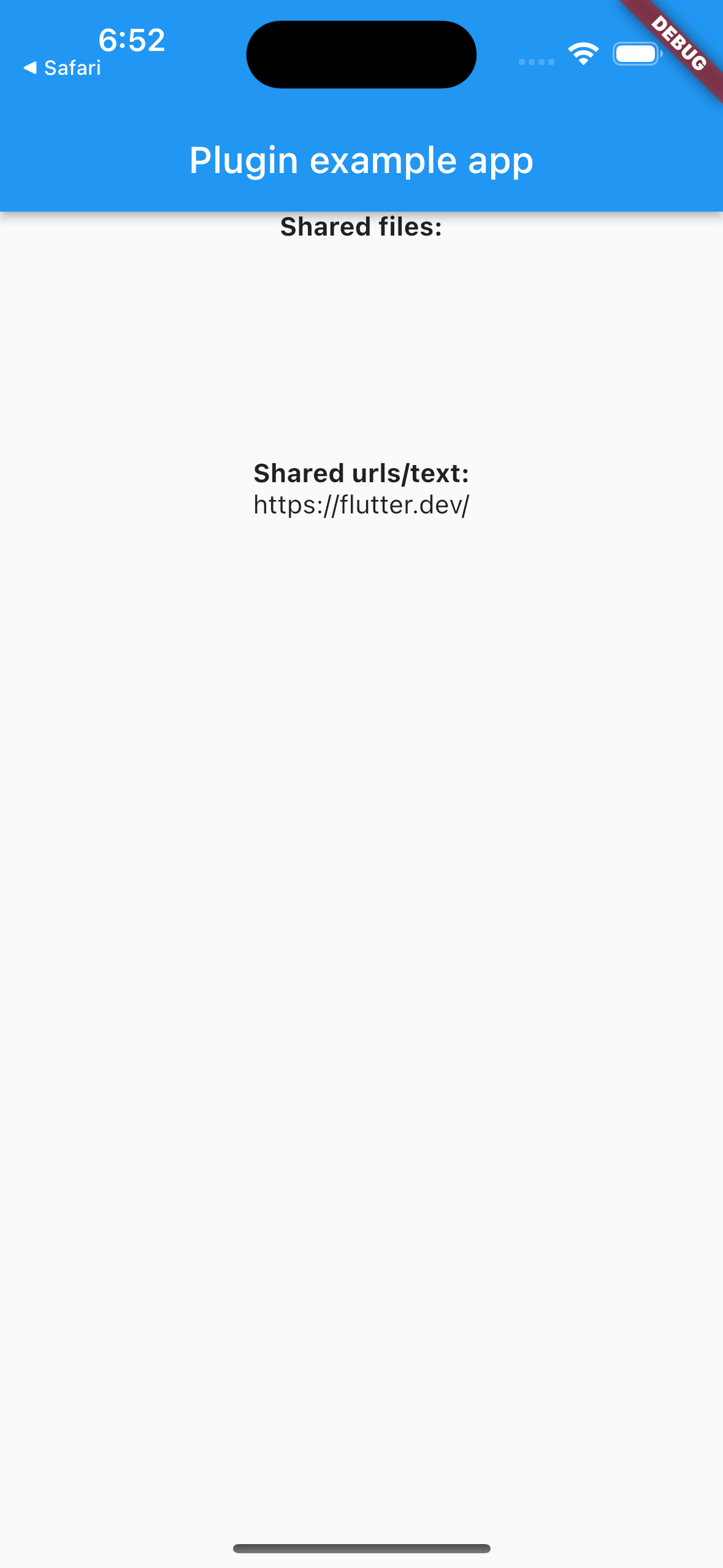 Step 10: 구현해본 모습입니다. 저는 사파리 브라우저에서 flutter.dev 웹사이트를 여기로 공유해보았습니다. Shared urls에 잘 표시되는 것을 확인해볼 수 있습니다.