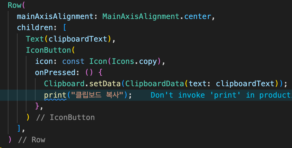 여기 위에서 중요한 부분은 보통 내용 등은 변수로 데이터를 전달하기 때문에 onPressed 눌렀을 시, Clipboard.setData를 활용하여 복사를 구현할 수 있습니다. IconButton 이외에 GestureDetector 등 여러 가지 방법으로 구현이 가능합니다.