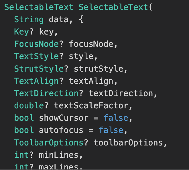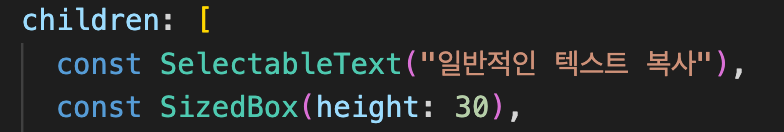 위에 있는 SelectableText 위젯 사용하시면 바로 사용 가능하며 기본 material.dart에 있는 것을 활용하기 때문에 패키지를 설치할 필요가 없습니다. 아래와 같이 일반 텍스트(Text) 위젯처럼 여러 가지 parameter를 부여할 수 있습니다.