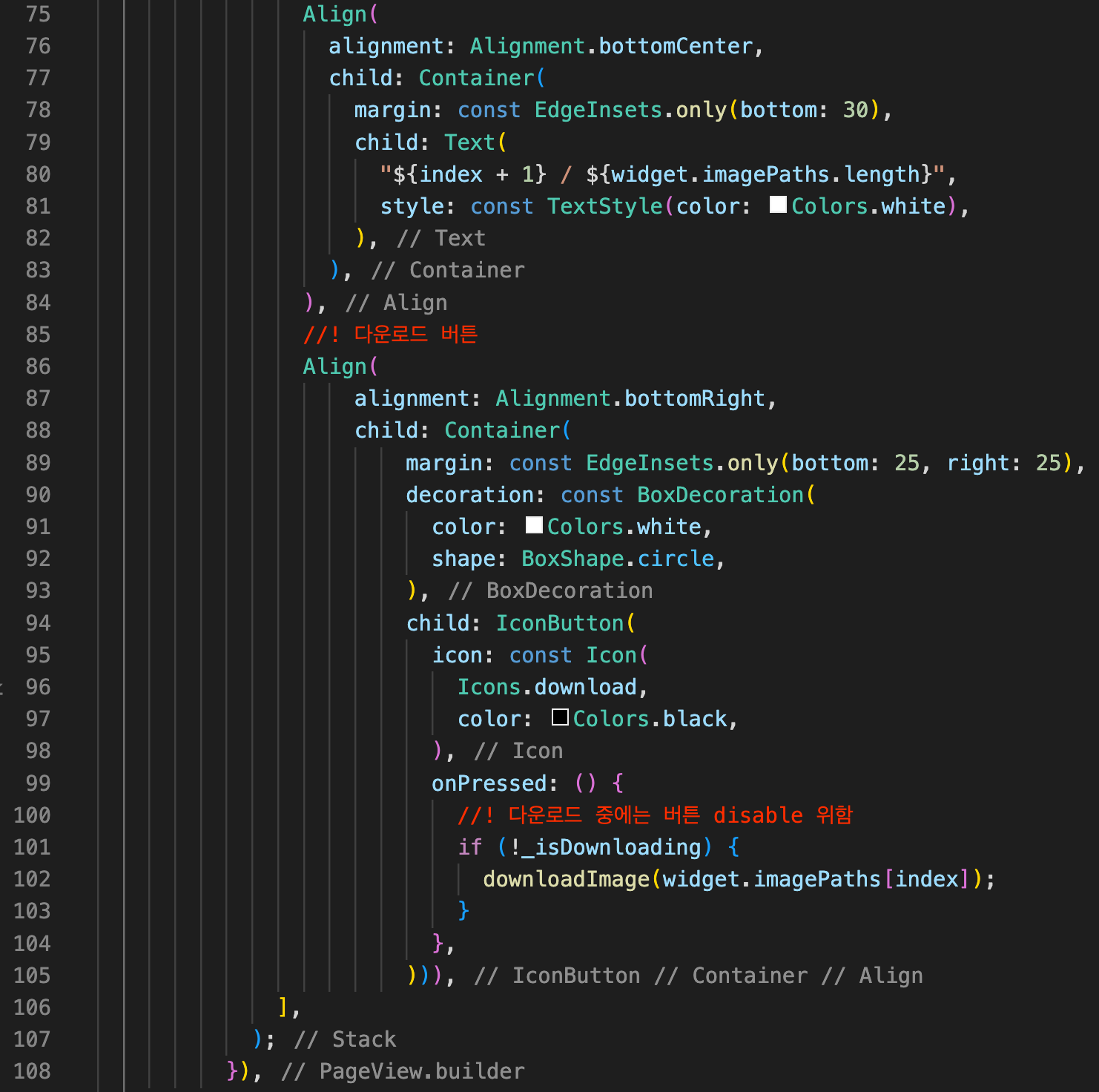 Step 3: 기존에 있던 부분 밑에 85번째 줄부터 Align 위젯을 이용하여 다운로드 버튼을 구현해주고 101-103번째 줄을 통해 메소드를 호출해주시면 마무리됩니다.