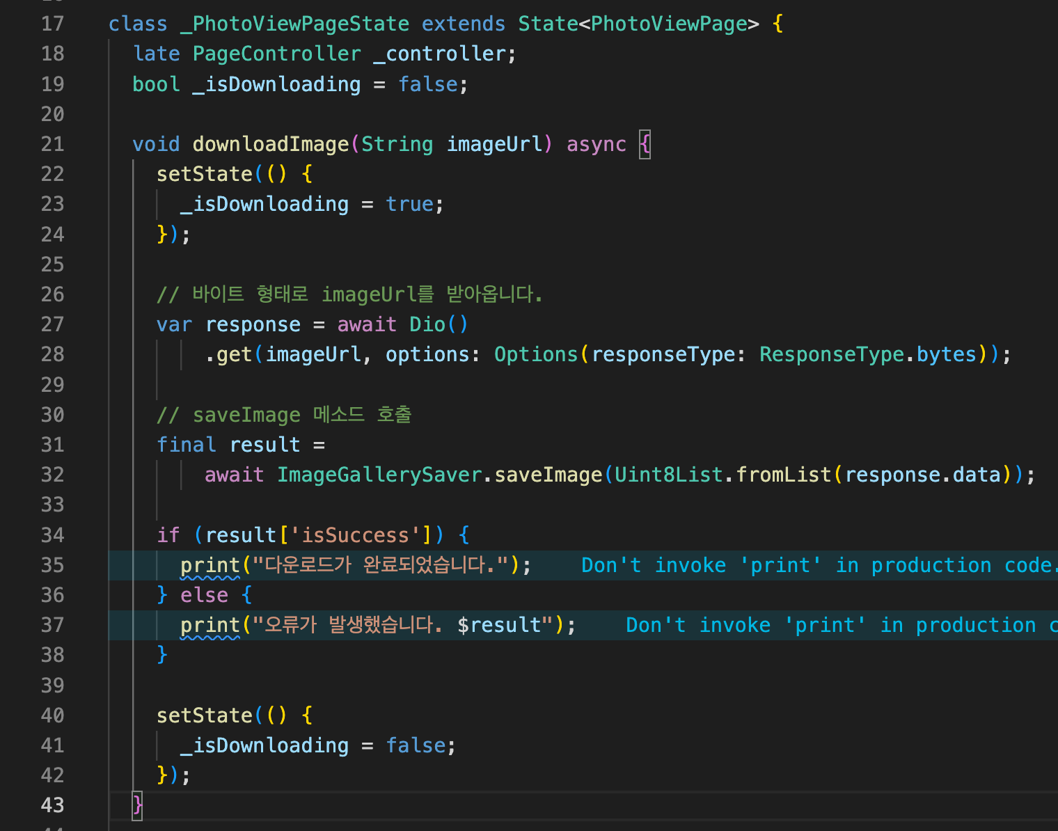 Step 2: 다음처럼 임포트하시고 _isDownloading 변수와 downloadImage 메소드를 추가해줍니다.