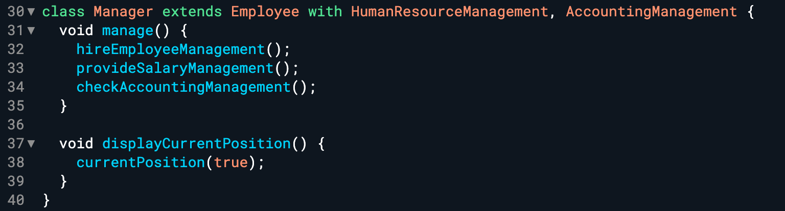 Manager의 클래스를 만들어주고 Employee를 상속하고 HumanResourceManagement와 AccountingManagement의 Mixin들도 함께하도록 만들어줍니다. 이러면 manage의 한 메소드에서 모두 상속하고 있는 메소드들을 모두 호출할 수 있습니다.