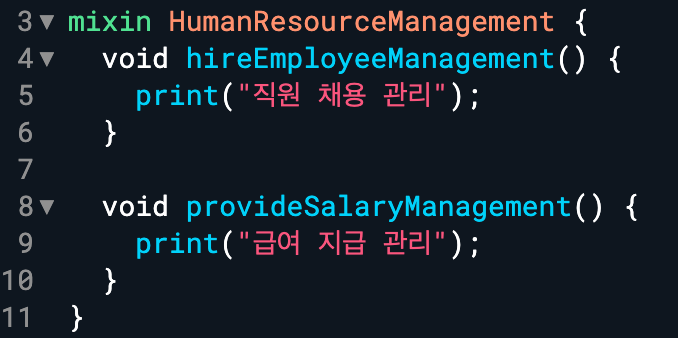 mixin을 사용하기 위해서는 class 키워드 대신 mixin을 입력하여 사용합니다. HR 파트 mixin을 입력합니다.
