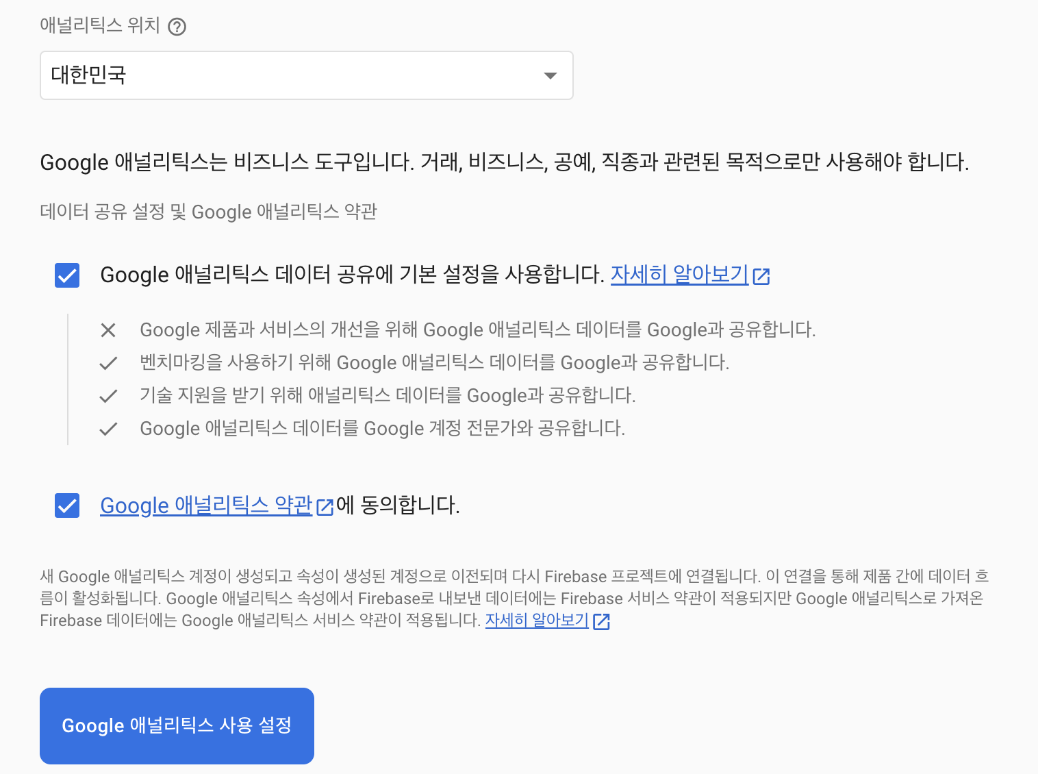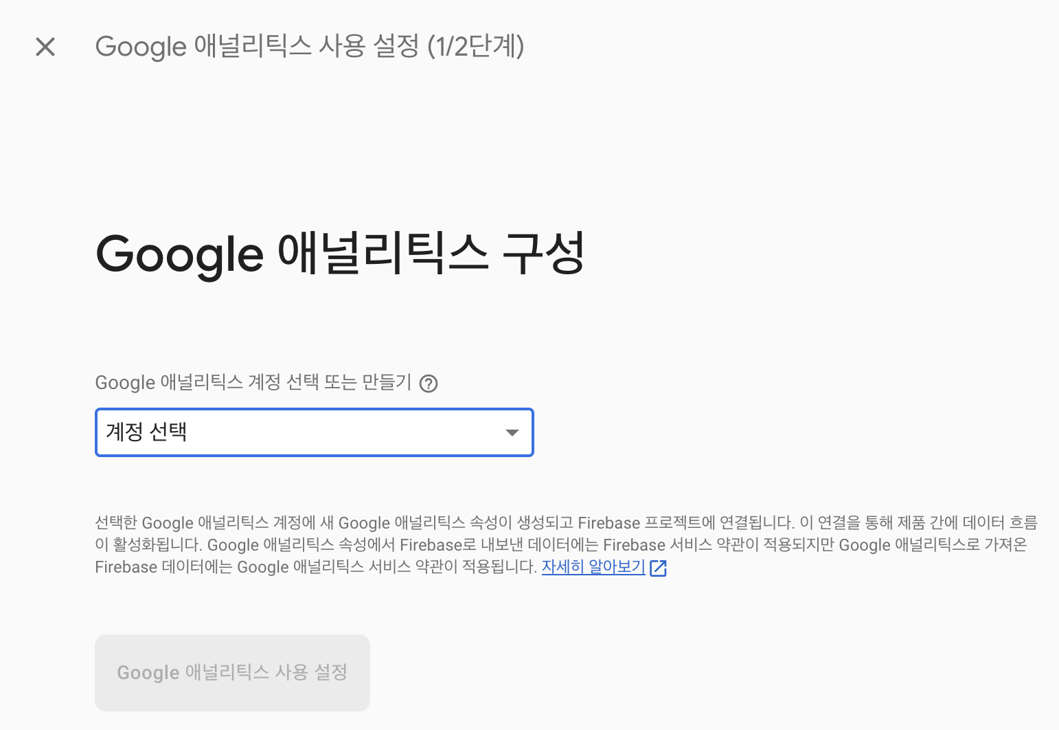 Step 1: 파이어베이스에 접속 -> 프로젝트 설정 -> 통합 -> Google Analytics 사용 설정을 눌러줍니다 (이미 되어 있는 경우에는 스킵하시면 됩니다)