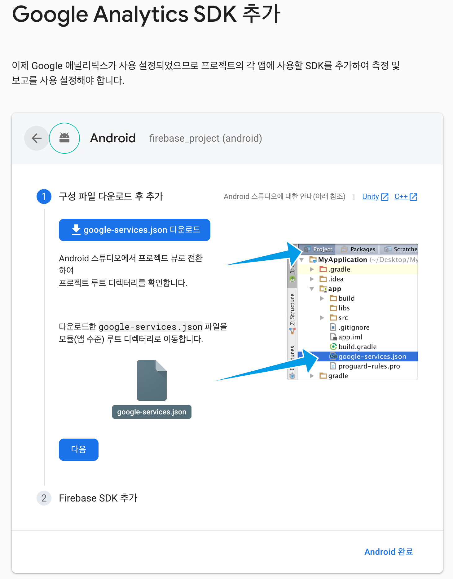 안드로이드는 google-services.json를 Android/app 경로에 다운로드하여 넣어주시면 되고 iOS는 GoogleService-Info.plist를 ios/Runner 경로에 넣어주시면 됩니다.