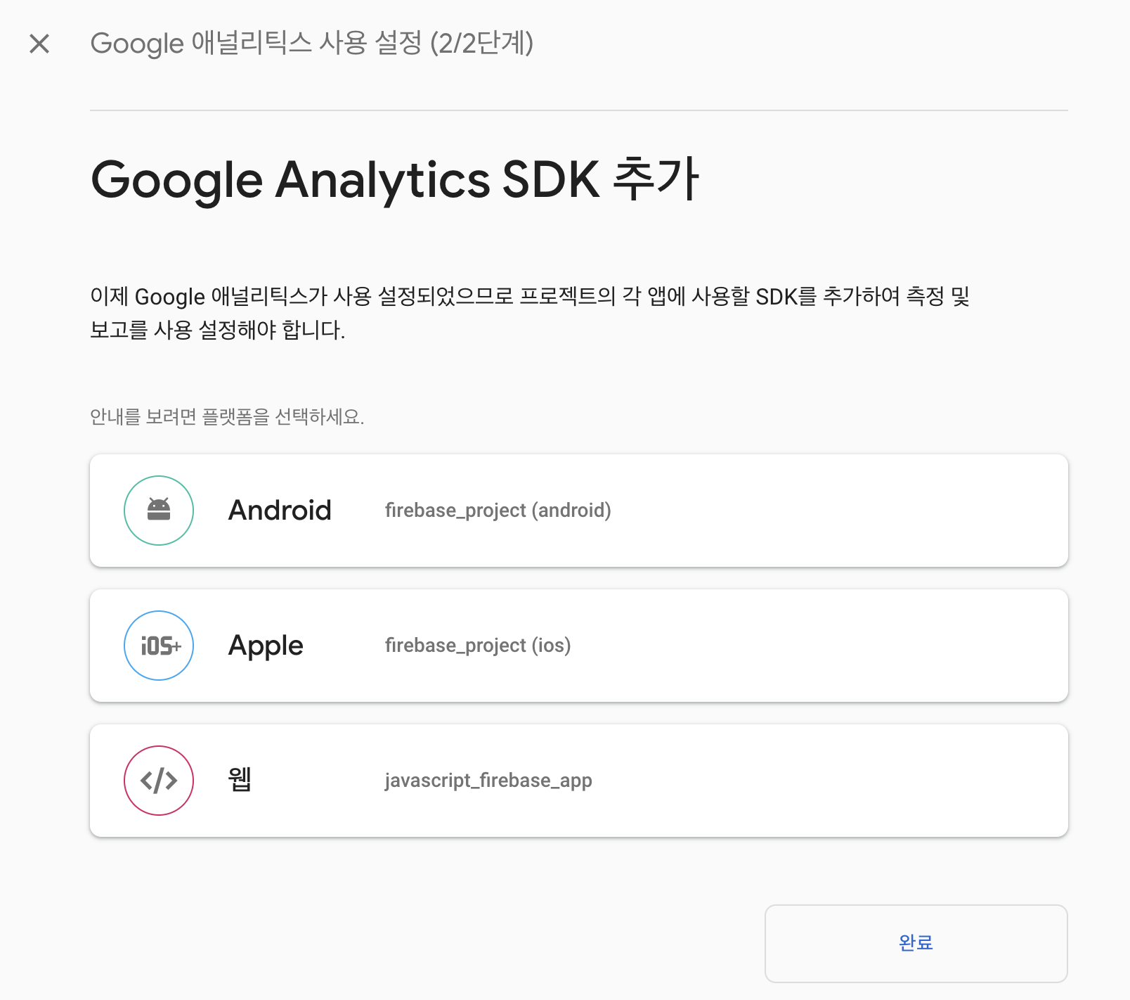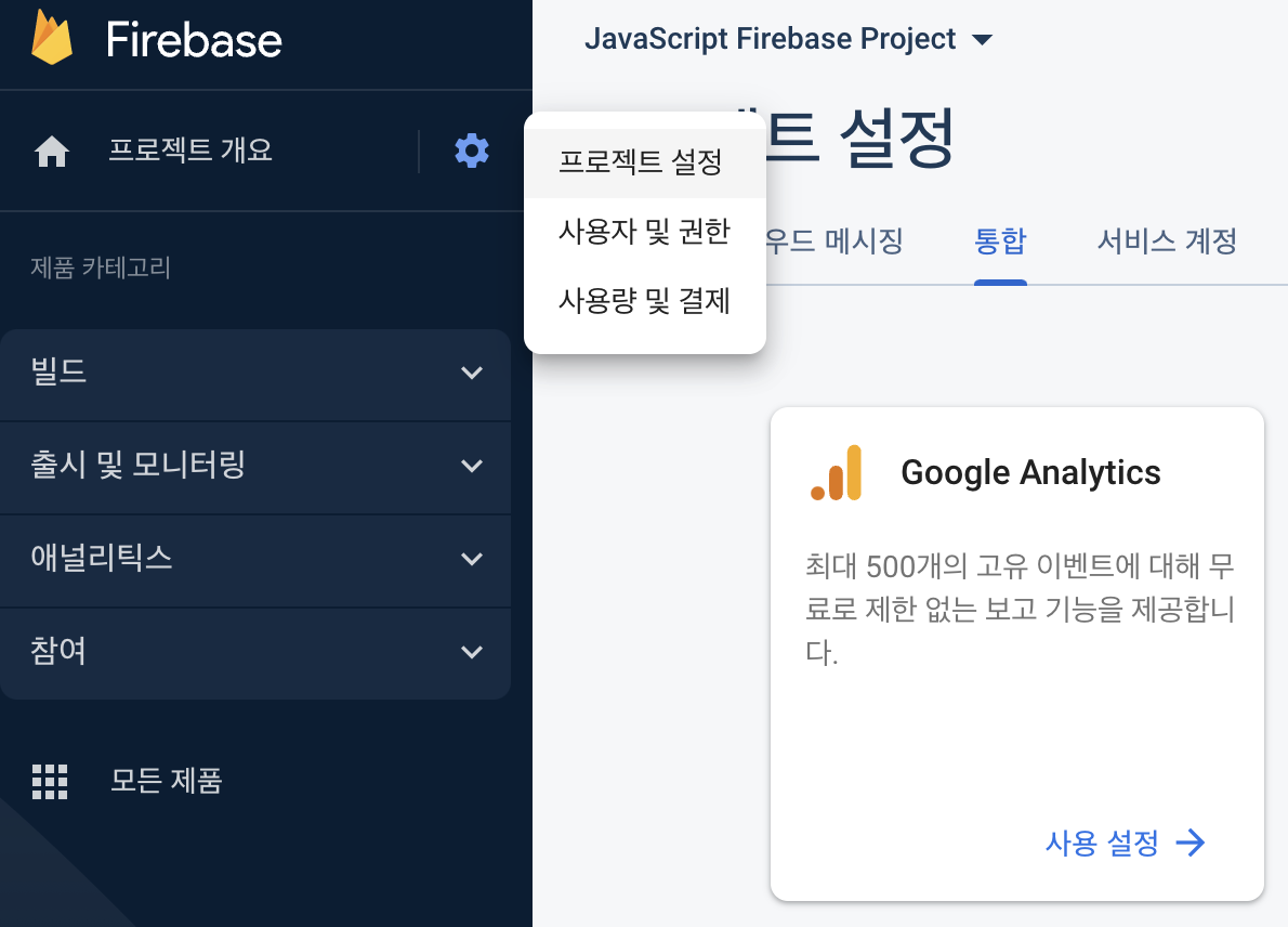 Step 7: 파이어베이스 -> 프로젝트 설정 -> 통합 경로를 통해 애널리틱스로 들어갑니다.