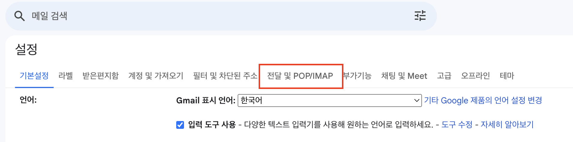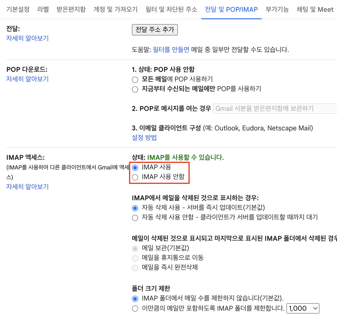 Step 2: "전달 및 POP/IMAP" 메뉴를 클릭합니다.