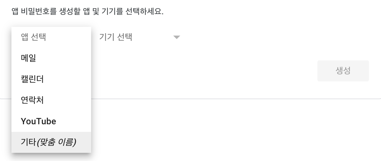 Step 8: 기타(맞춤 이름)를 선택하시고 phpmailer 등 맞춤 이름으로 지정하여 생성하시면 비밀번호가 나오는데 이 비밀번호를 복사해줍니다. 이 비밀번호는 더 이상 확인되지 않기 때문에 잘 복사해서 추후 PHP 코드에 붙여넣기 해야 합니다.