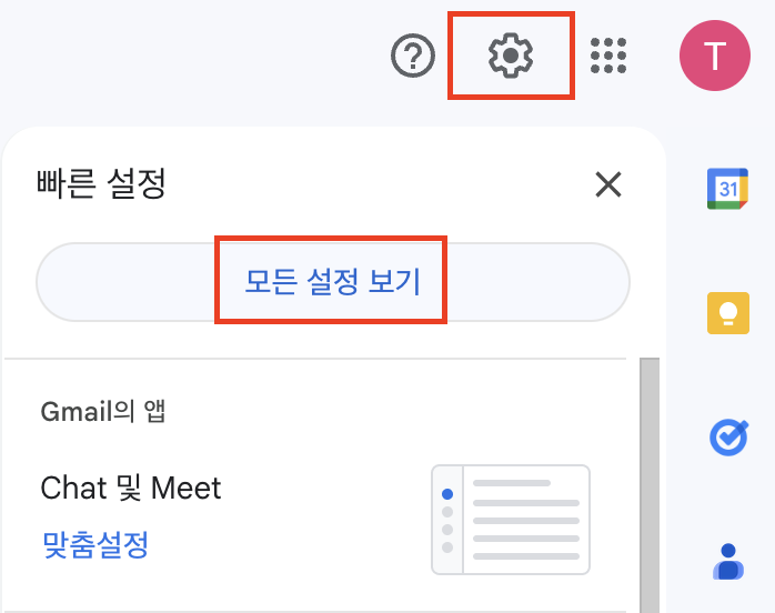 Step 1: 먼저 구글에 로그인하여 gmail로 들어갑니다. 들어가서 설정 버튼을 누르시고 "모든 설정 보기"를 누릅니다.