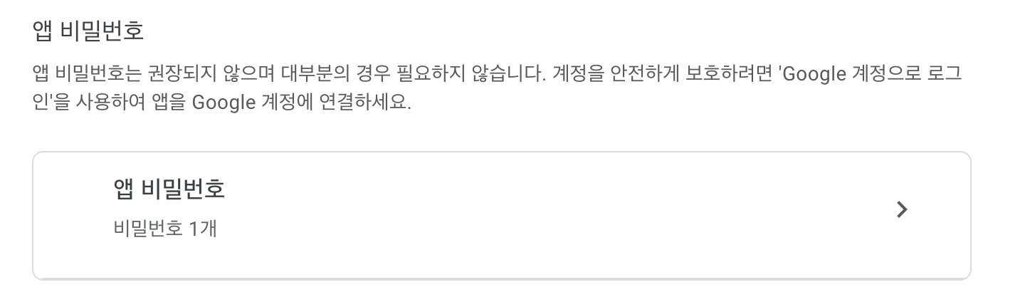 Step 7: 2단계 인증이 아직 완료되지 않은 경우 휴대폰 번호 등을 통하여 먼저 완료하여 주시고 그 다음 아래에 "앱 비밀번호"라고 나와 있는데 그 부분을 클릭합니다. (저는 이미 되어 있어 1개라고 나옵니다)