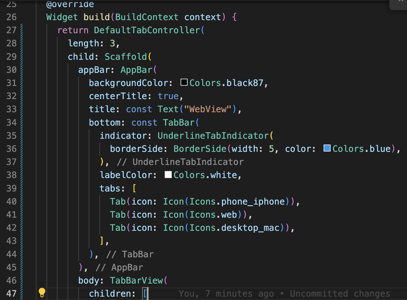 Step 4: DefaultTabController 위젯을 추가하여 줍니다. 만약에 변수로 아이콘이나 텍스트를 할당해서 오류가 발생하는 경우에는 const를 빼주시면 됩니다.
