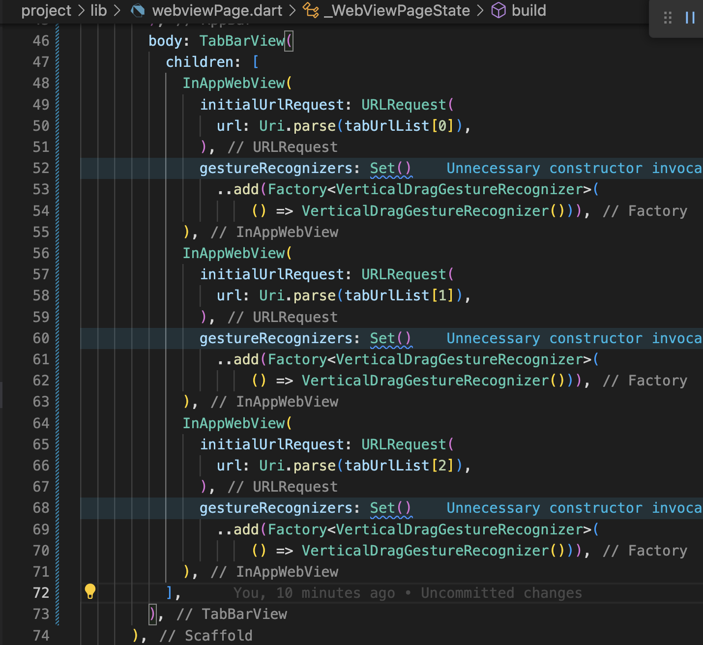 WebView를 사용할 때 패키지는 주로 flutter_inappwebview나 webview_flutter가 사용됩니다. 이 때 flutter_inappwebview를 사용하고 TabBarView를 이용할 때 스크롤이 되지 않는 문제가 있는데 그 때에는 아래 Stackoverflow에 나와 있는 대로 Set()..add 부분을 추가해주시면 됩니다.