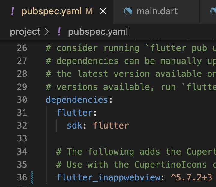 Step 1: 먼저 pubspec.yaml에 flutter_inappwebview 패키지를 추가해줍니다. flutter pub get해줍니다.