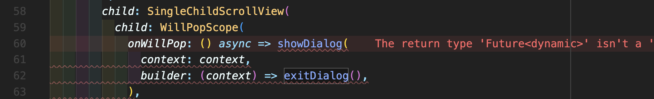 아래 같은 에러를 보시면 The return type 'Future<dynamic>' isn't a 'Future<bool>'이라고 나옵니다.