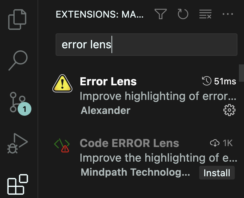 Step 4: dart 코드에 있는 에러들을 하나씩 수정하면 됩니다. VSCode에서 extension에 들어가서 Error Lens를 활성화해주시고 에러를 해결하면 됩니다.