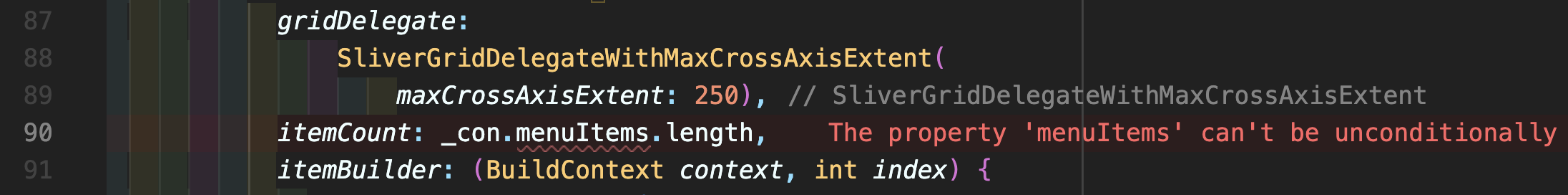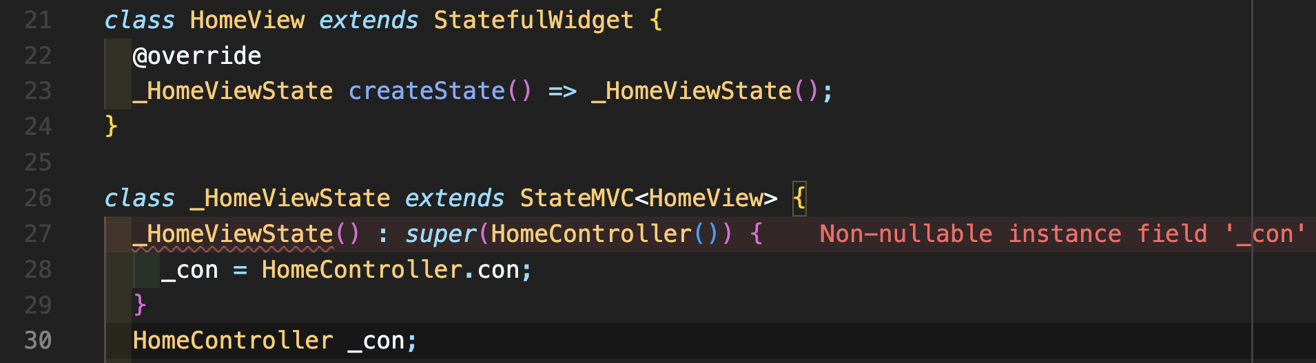 위에 보시면 Non-nullable instance field '_con'이라고 나와 있습니다. 그 아래에 _con이 null이 될 수 없다고 뜹니다.