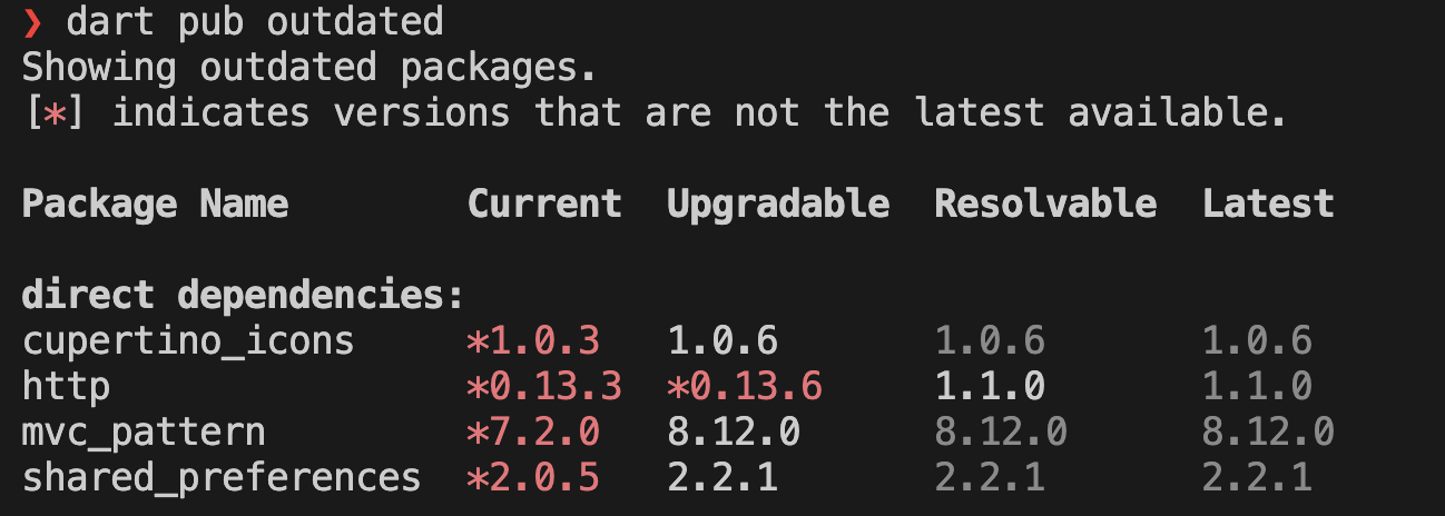 Step 3: 그리고 pubspec.yaml에 있는 패키지들이 Null Safety를 진행하는 지 알기 위해 dart pub outdated로 체크할 수 있고 dart pub upgrade를 통해 업데이트를 해줄 수 있습니다.