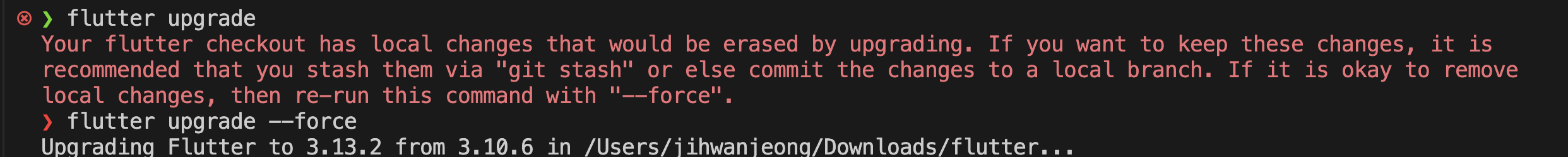 Step 1: 먼저 플러터 업그레이드를 진행합니다. flutter upgrade를 했을 때 아래처럼 메시지가 나온다면 git stash를 하거나 먼저 commit를 먼저 하시면 됩니다. 그 후에 flutter upgrade --force 키워드로 진행하시면 됩니다. 업그레이드 하시면 보통 null safety 진행됩니다. flutter 3.0 이후로는 dart migrate 키워드가 아니라 flutter upgrade하면 이미 적용이 되는 것으로 보입니다. dart migrate를 하면 터미널에서 진행 안 됩니다.