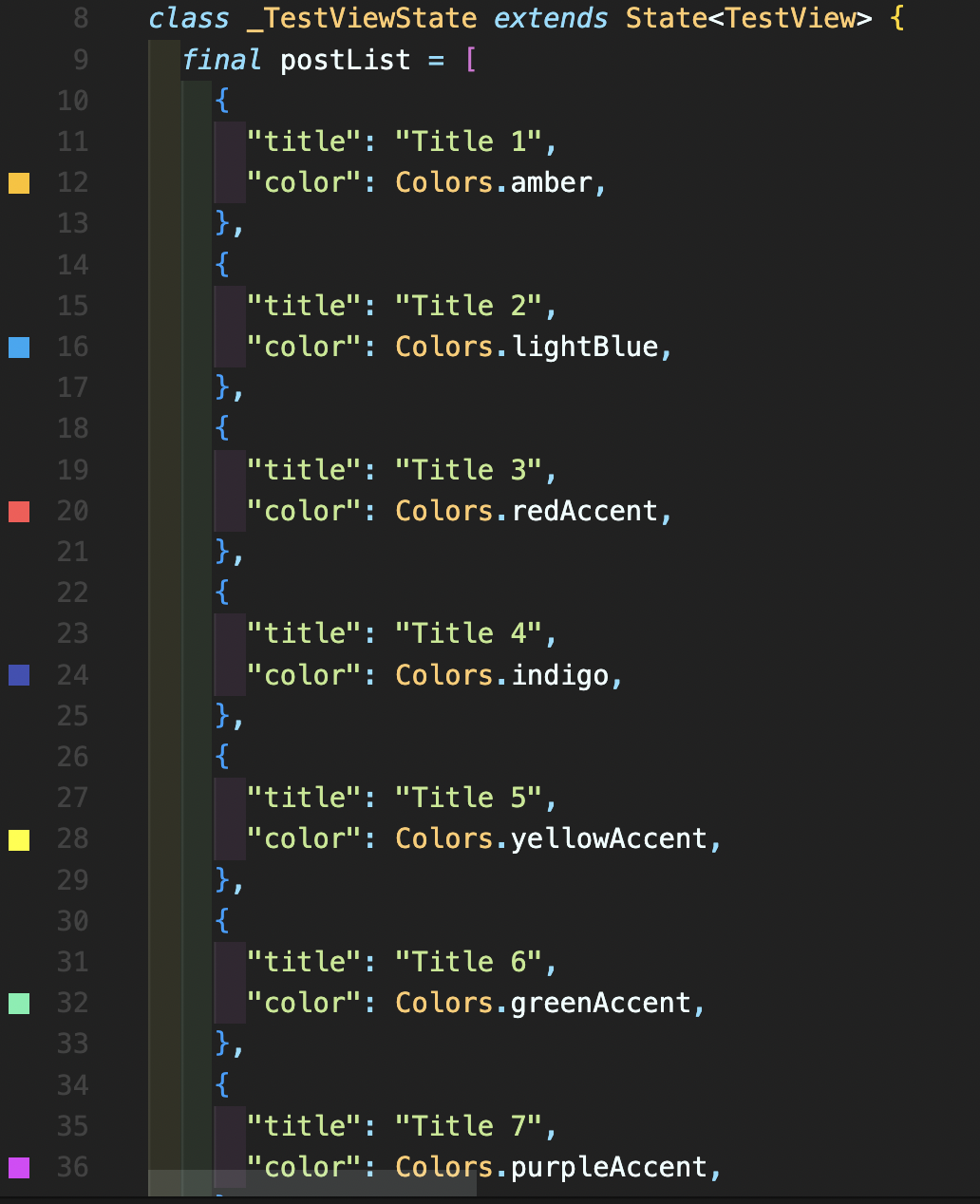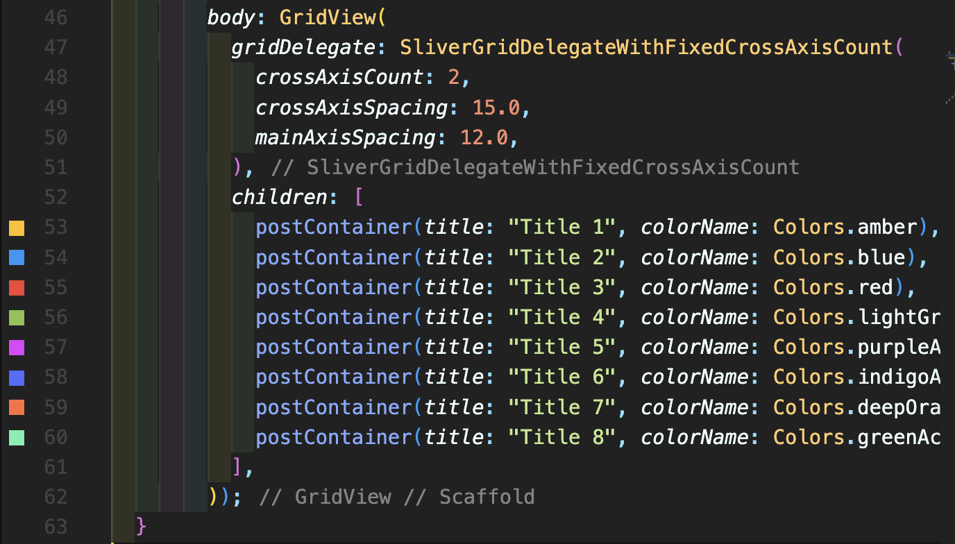 기존 GridView로 코드를 구성했던 모습입니다. 53번째부터 60번째 줄을 보면 postContainer 메소드가 8번 반복되고 있는 것을 알 수 있습니다. 이것을 GridView.builder를 이용하면 코드를 간소화할 수 있습니다. 먼저 GridView.builder를 위해서는 ListView.builder와 동일하게 배열을 사용하기 때문에 여기서도 미리 선언하겠습니다.