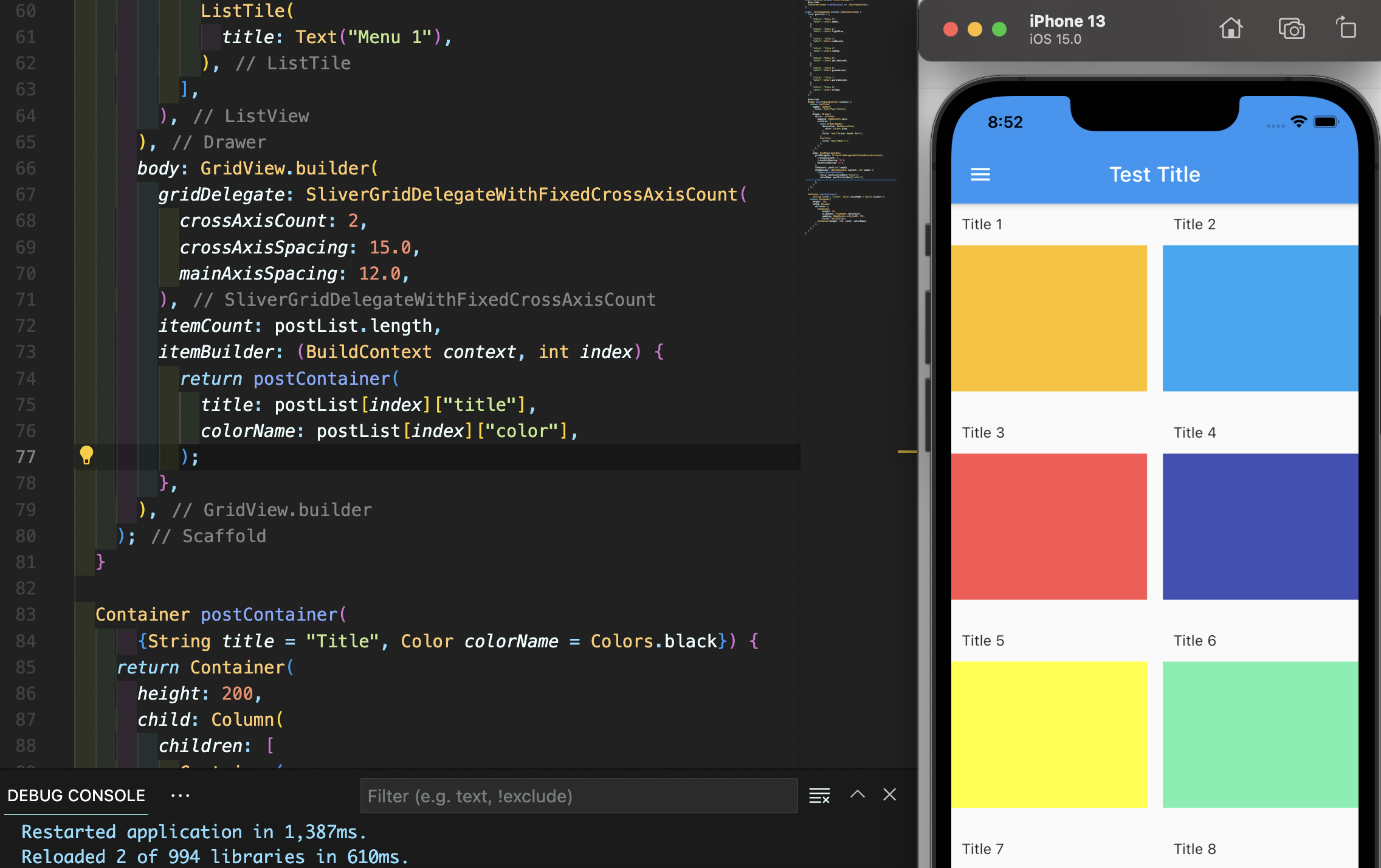 GridView.builder를 적용한 모습입니다. gridDelegate는 동일하게 적용하였고, 72번째 줄에 itemCount 부분에 postList의 길이를 넣어주고, 73번째 줄에 itemBuilder를 활용하여 index를 기반으로 postList 전체를 출력하도록 합니다. 코드가 상당히 간결해진 것을 알 수 있습니다. GridView.builder를 위해서 필요한 것은 gridDelegate + itemCount + itemBuilder이며 이미 데이터가 있는 리스트가 필요합니다. 다음 시간에는 스크롤을 가능하게 만들어주는 SingleChildScrollView 위젯에 대해 살펴보도록 하겠습니다. 감사합니다.