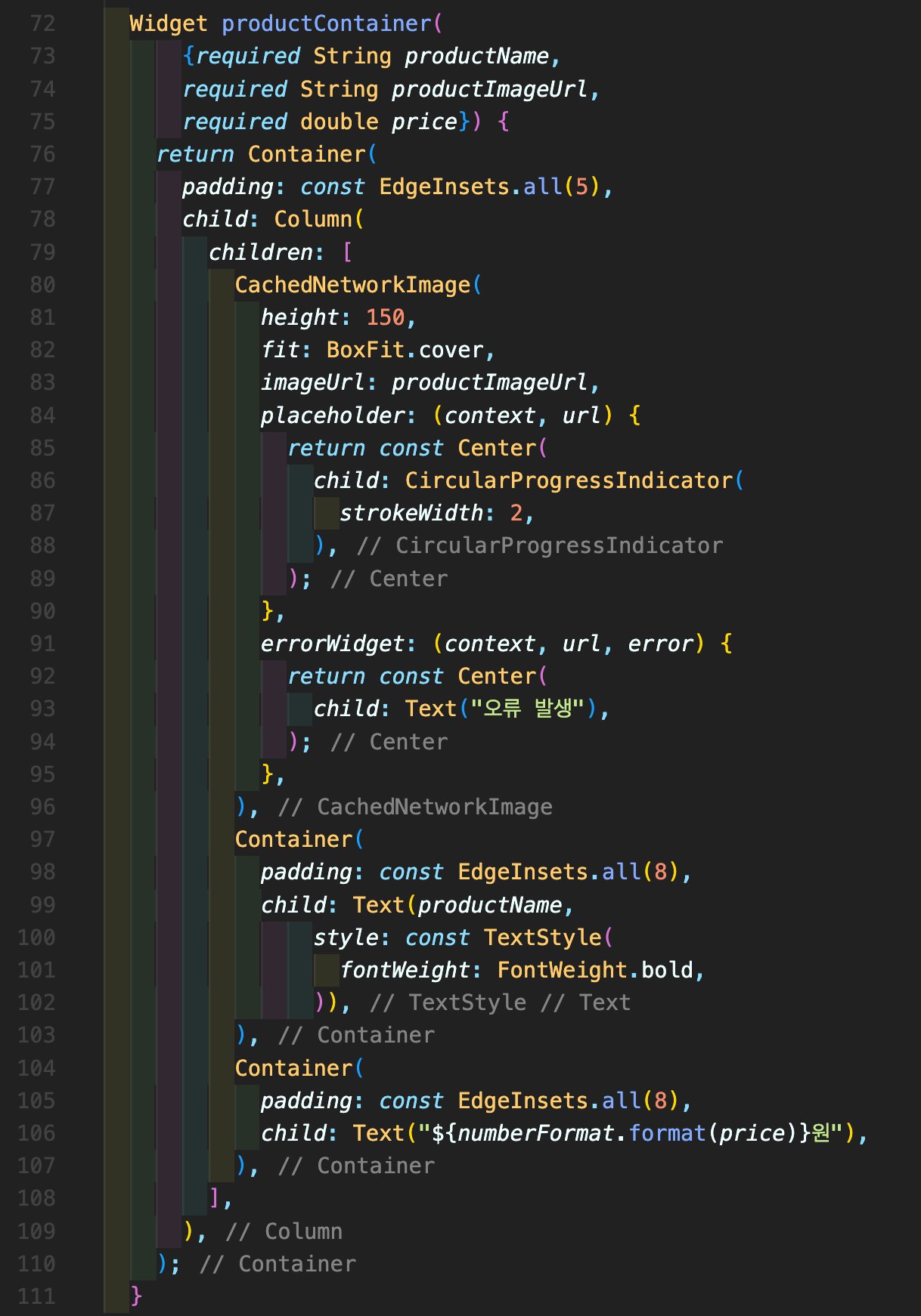 Step 7: productContainer 위젯을 만들어줍니다. 여기에서 productName, productImageUrl, price를 매개변수로 받아 각각의 위젯에 전달해줍니다. 이미지는 CachedNetworkImage 위젯을 사용하는데 기본 Image.network 위젯을 사용해도 되지만 중복되는 이미지라면 이미 캐싱된 것을 가져오기 때문에 성능적으로 도움이 됩니다. placeholder를 사용하여 이미지 로딩중을 표시해주고 errorWidget을 통해 오류 발생을 출력할 수 있도록 해줍니다.