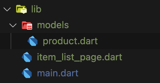 Step 2: lib 폴더 하위에 item_list_page.dart 파일을 생성하고 models 폴더를 생성하신 후 product.dart를 생성합니다.
