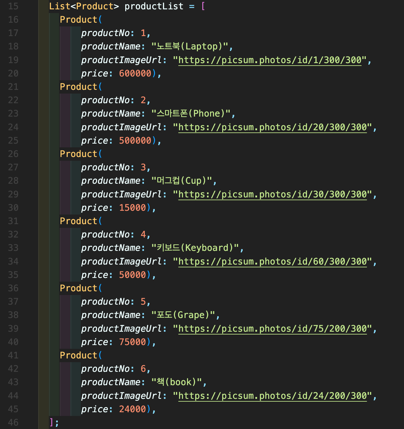 Step 6: 간단한 구현에 필요한 Mock Data를 위해 배열을 생성해줍니다. (맨 아래에 item_list_page.dart 코드 첨부하였으니 거기에서 복사하실 수 있습니다.) 이미지는 picsum의 이미지 링크를 사용합니다.