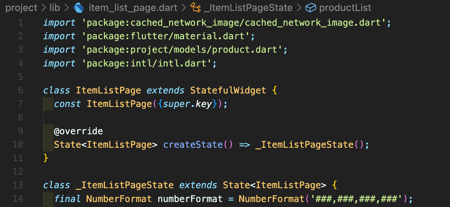 Step 5: 아래처럼 item_list_page.dart를 작성합니다. 14번째 줄에 보시면 numberFormat를 사용하는데 100000원을 1,000,000원으로 출력하기 위함입니다. 그래서 intl 패키지를 사용하였습니다.
