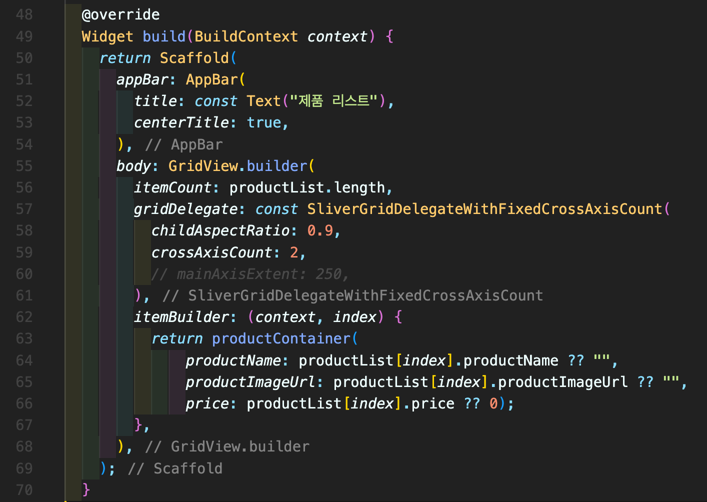 Step 8: 마지막으로 GridView.builder 부분을 넣어 완성해줍니다. gridView는 gridDelegate와 itemBuilder를 반드시 넣어주어야 하는데 gridDelegate에 각각 childAspectRatio를 넣어 높이 비율을 조절하시고 crossAxisCount를 통해 각각 몇 열이 들어가는지 지정해줄 수 있습니다.