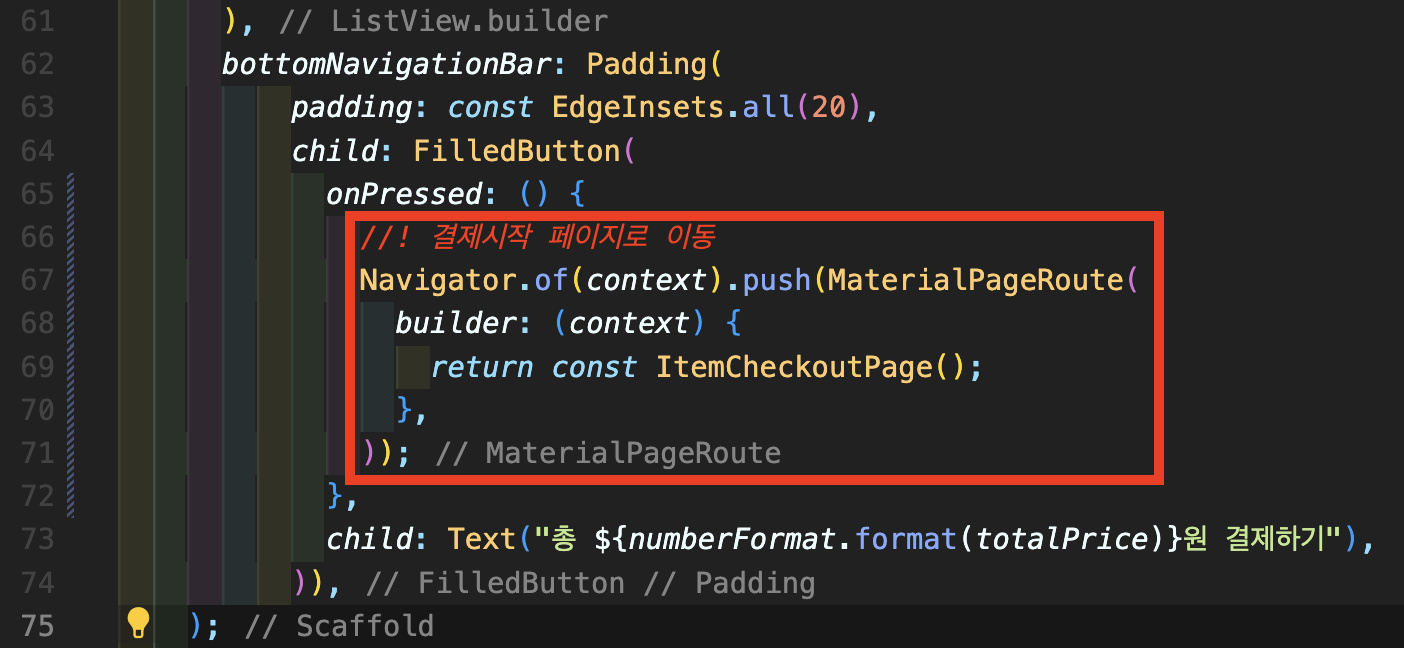 Step 5: item_basket_page.dart를 열어주셔서 다음처럼 onPressed 안에 결제시작 페이지로 이동할 수 있도록 Navigator push를 넣어줍니다.