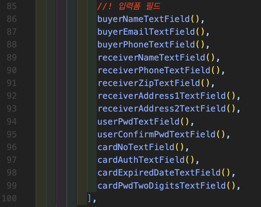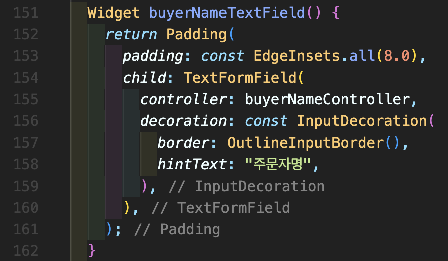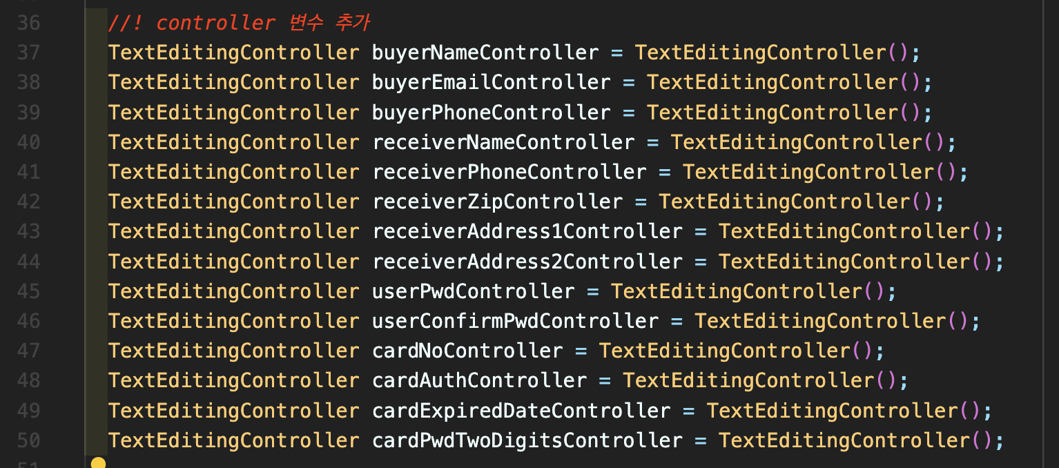 Step 8: 이제 입력할 수 있는 폼을 넣어야 하는데, 여기에는 주문자, 이메일, 휴대전화, 배송지(받는 사람, 주소, 받는 사람 휴대전화, 비회원 주문조회 비밀번호), 결제수단(카드, 무통장입금 등) 정보 등 많은 입력필드가 필요합니다. 먼저 아래 TextEditingController를 쭉 추가해주시면 됩니다.