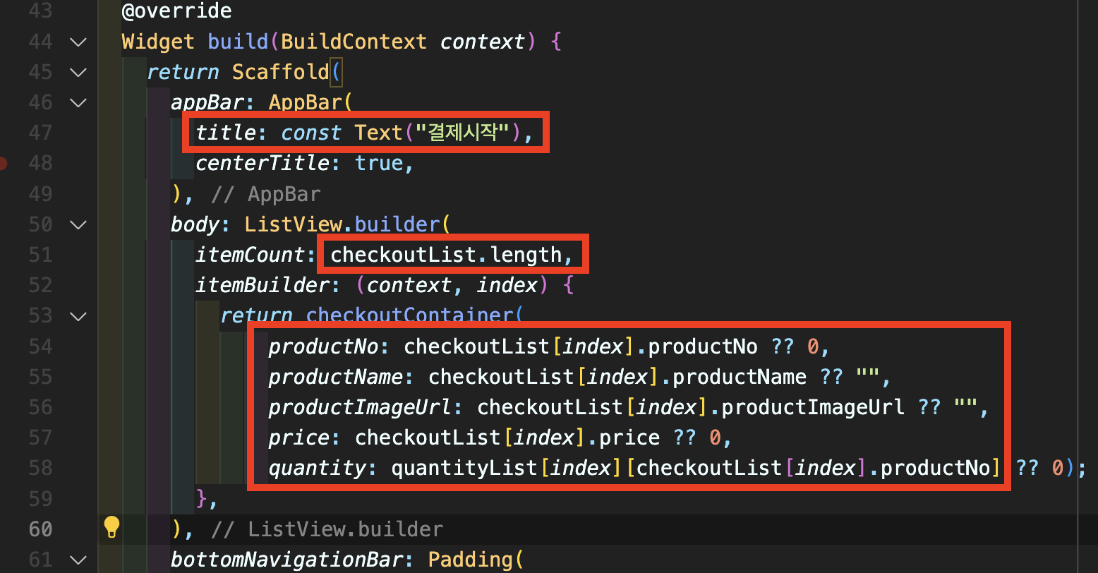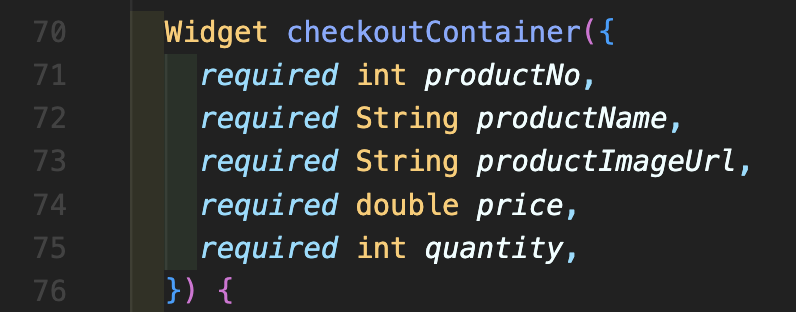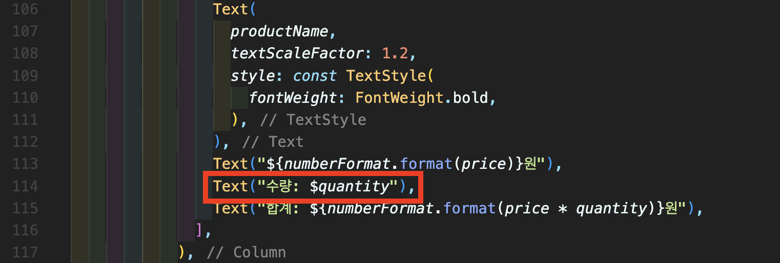 Step 7: 장바구니 페이지와 달리 결제시작에서는 수량을 수정할 수 없고 제품 또한 제거하지 못하도록 막아야 하기 때문에 여기에서는 수량만 표시해주시고 수량을 조절하는 버튼과 제거 버튼은 모두 없애줍니다. basketContainer에서 Row로 구성되어 있던 부분을 Text 위젯 하나로 모두 표현해주시면 됩니다.