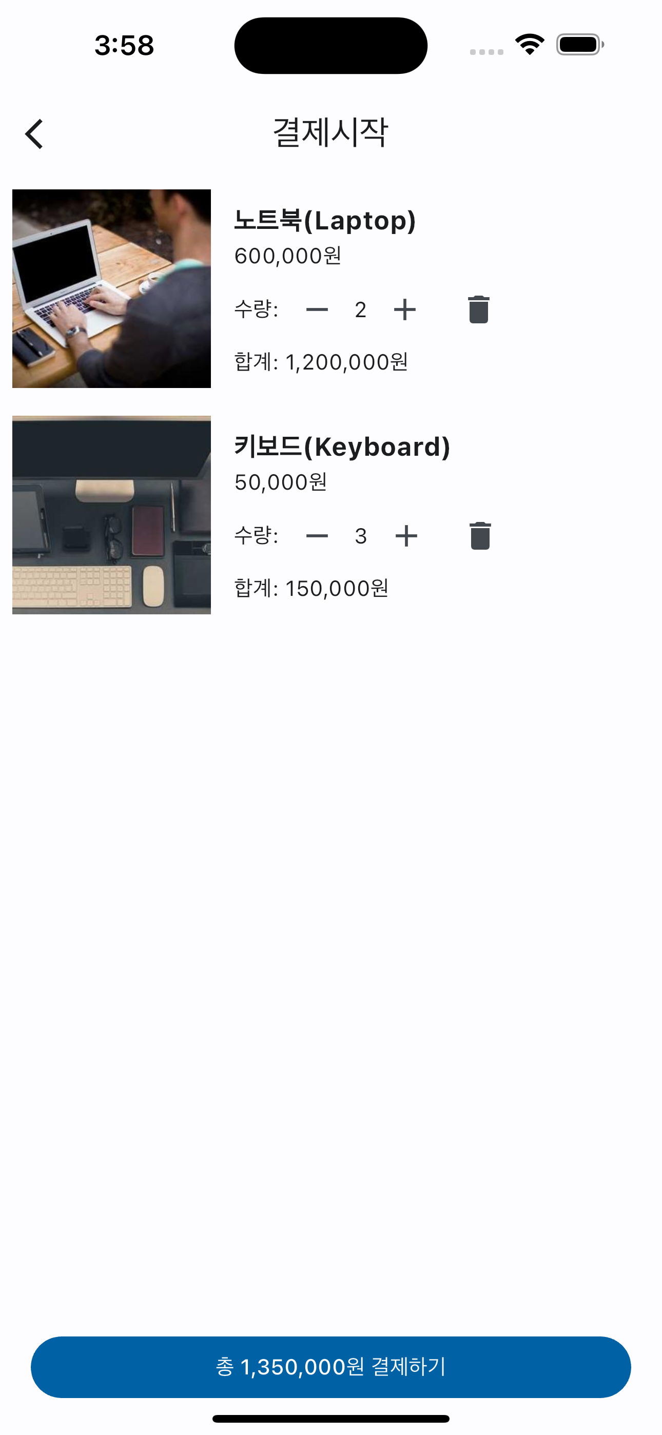 Step 6: 완료되었다면 저장을 하시고 장바구니 페이지에서 총 1,350,000원 결제하기 파란색 버튼을 누르시면 아래 화면처럼 '결제시작' 페이지로 랜딩이 됩니다.