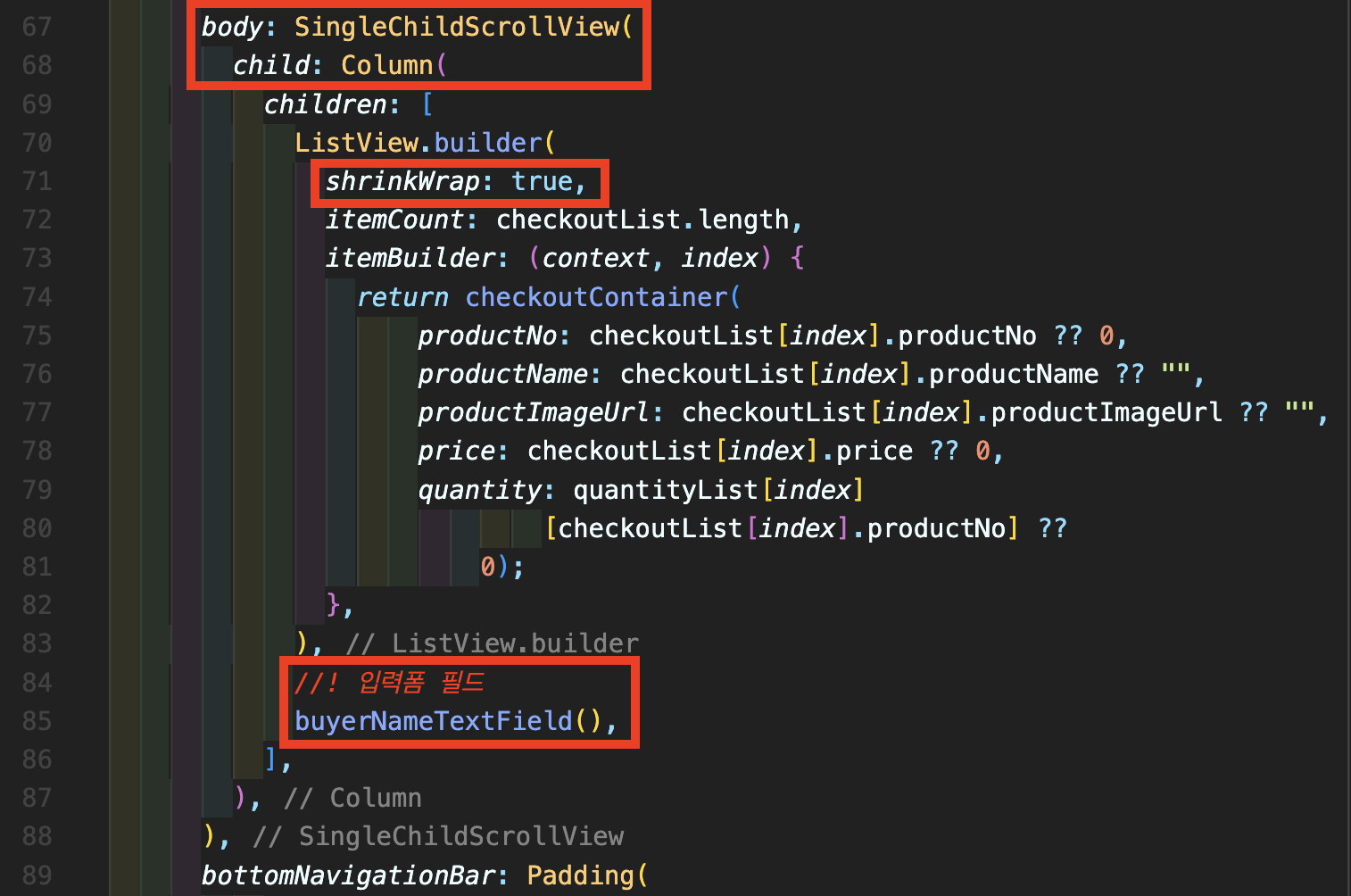 Step 10: body 부분을 수정합니다. ListView.builder 밑에 입력필드들을 두어야 하기 때문에 Column으로 먼저 감싼 뒤, SingleChildScrollView로 다시 감싸줍니다. 그 후에 ListView.builder 내에 shrinkWrap: true를 넣으셔야 렌더링 오류가 발생하지 않습니다. 마지막에 buyerNameTextField()를 넣어서 잘 나오는지 확인합니다.