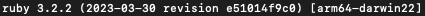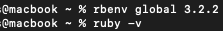 Step 5: rbenv global 3.2.2를 입력하여 ruby 버전을 변경해주고 ruby -v를 입력하여 버전을 체크해줍니다. 만약 ruby -v하였을 때 기존 버전이 그대로 나온다고 한다면 설치가 제대로 되지 않았거나 위의 경로가 제대로 세팅되지 않은 문제이기 때문에 Step 2부분을 다시 확인해주셔야 합니다.