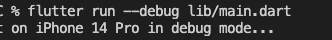 Step 8: 터미널에서 flutter run --debug lib/main.dart를 입력하여 실행해봅니다. 가끔 F5 디버그 모드는 오류가 나는 경우가 있어 F5 디버그 모드로 실행하는 것보다 처음에는 이 터미널 명령어로 실행하는 것이 좋습니다.