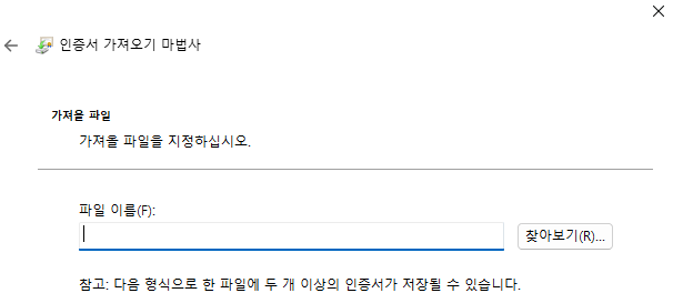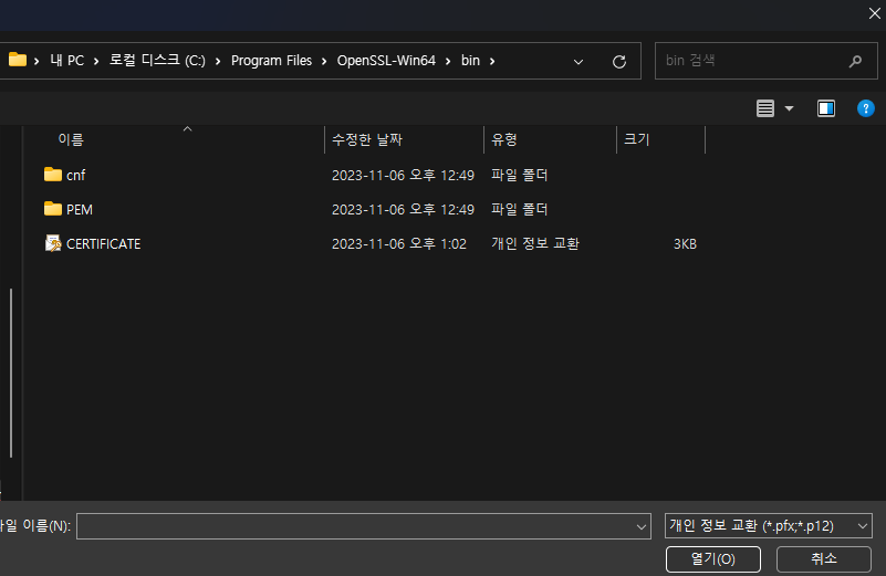 Step 15: 아래 확장자를 개인 정보 교환(pfx)으로 변경하시고 CERTIFICATE로 명명한 증명서를 선택하여 열어줍니다.