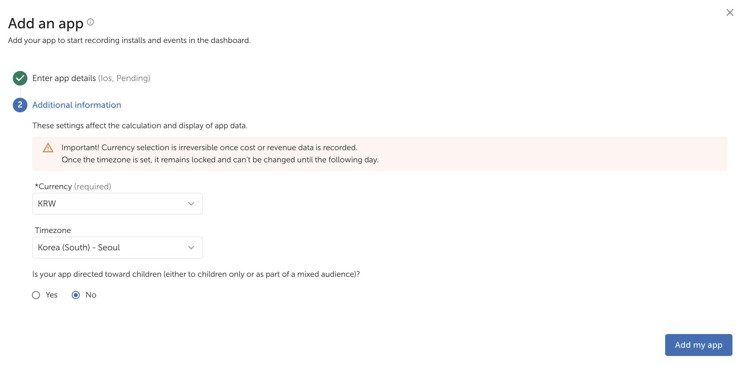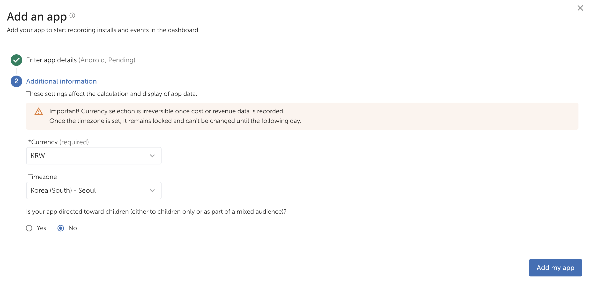 Step 11: 아래처럼 내용 입력 후 Add my app를 눌러주면 완료입니다.
