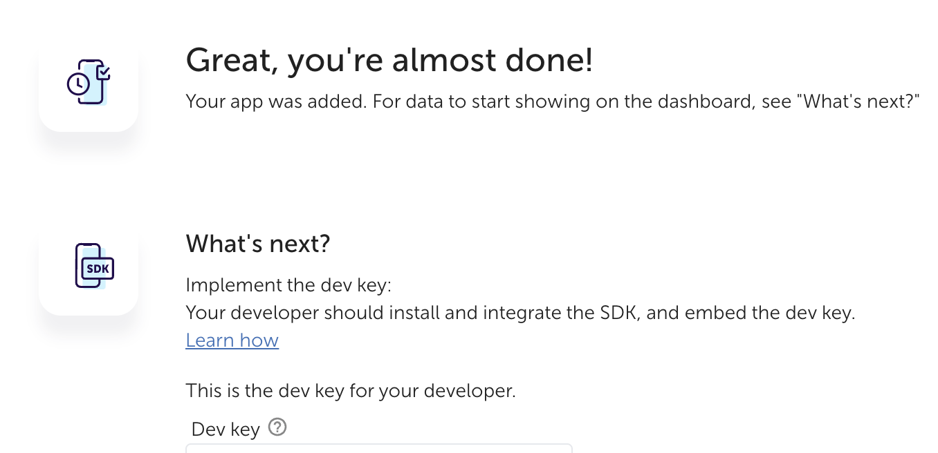 Step 6: 아래 Dev key가 나오는데 추후 설정 페이지에서 계속 볼 수 있지만 다른 곳에 복사해두시는 것을 권장합니다. (플러터 세팅할 때 넣어야 합니다)