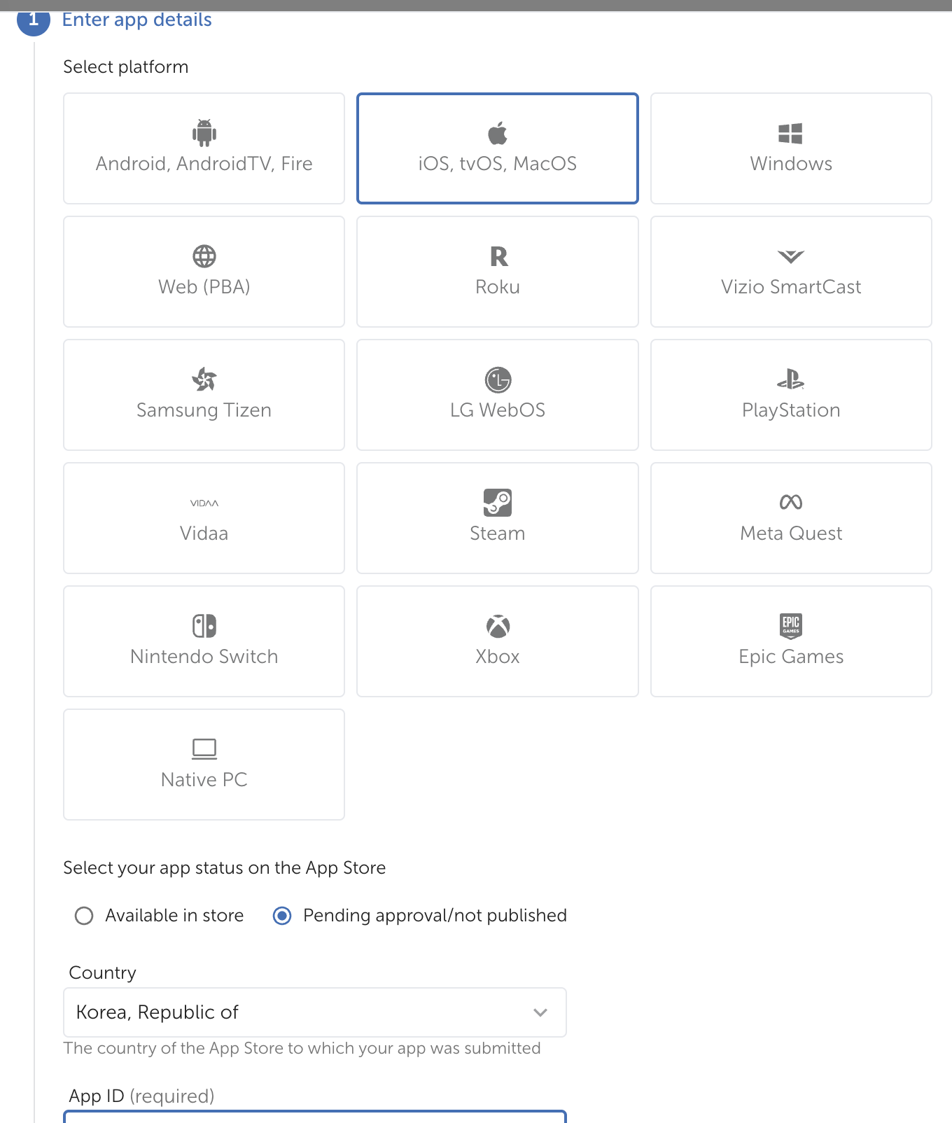 위에 App ID는 애플 개발자 계정이 있어 앱을 등록한 경우 생성되는 ID로 애플 개발자 계정이 없는 경우와 앱이 등록되지 않은 경우에는 사용이 안 됩니다.